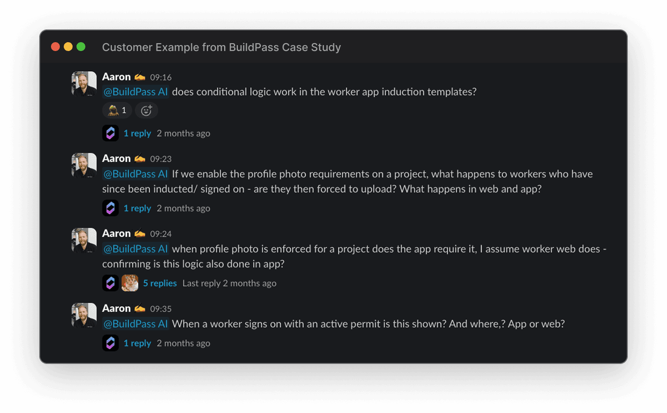 Since going live, BuildPass logs 160+ questions to Grapevine per week. The agent integrates into key Slack channels, answers direct messages, and proactively replies.