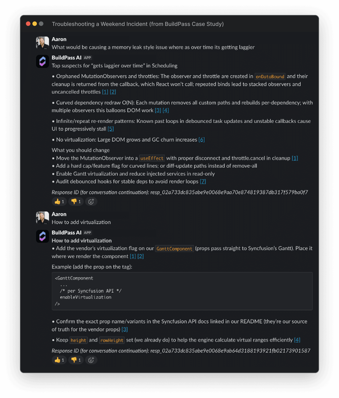 One Saturday, BuildPass had a production issue. They saw a performance regression in production and wanted to triage it quickly. Normally during an incident like this, Aaron would search through documentation and dig through old Slack threads, trying to remember what changed recently that might affect the system.