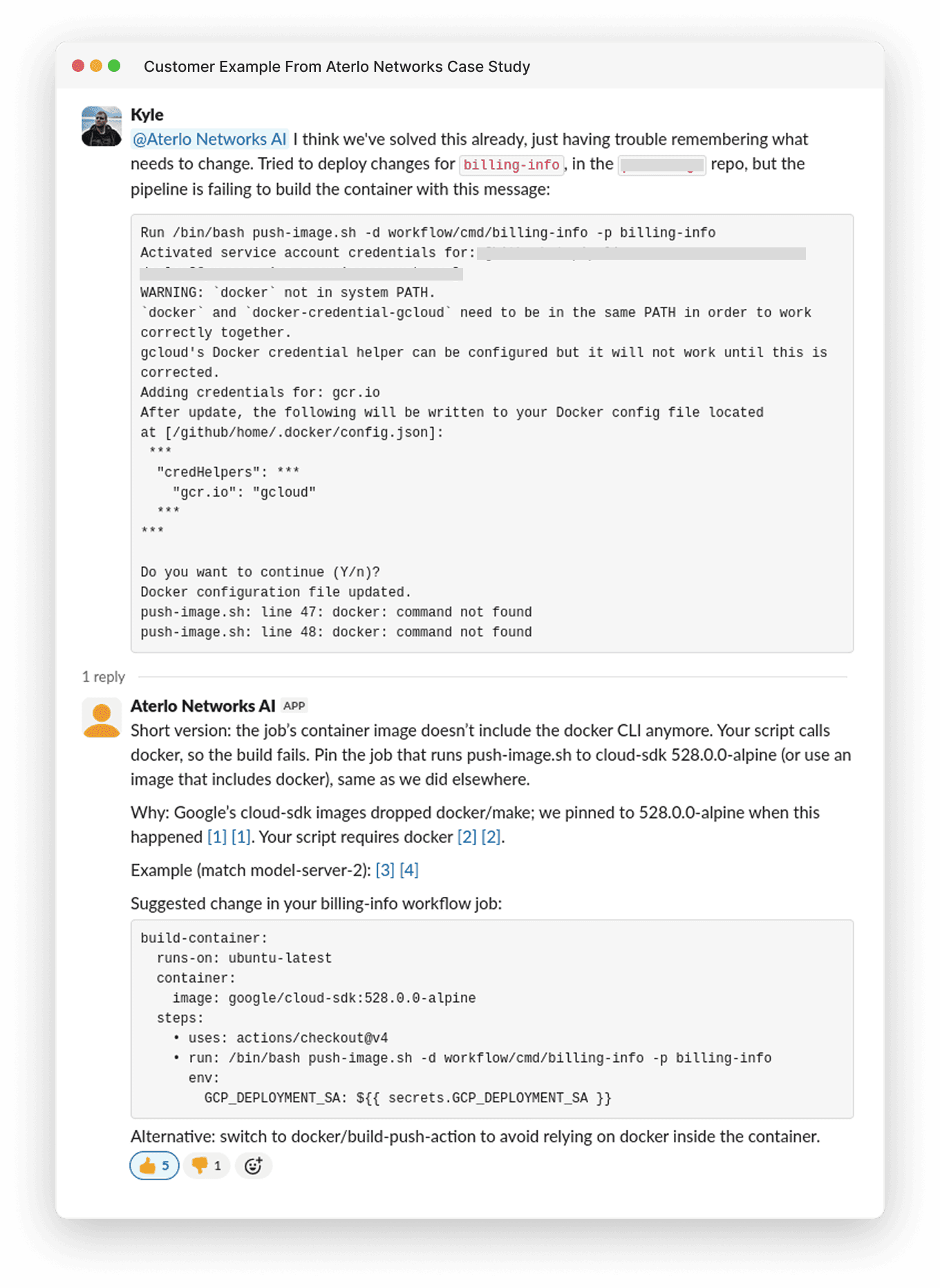 Kyle, a developer at Aterlo Networks, was troubleshooting a deployment issue for the billing-info job. "I think we've solved this already, just having trouble remembering what needs to change," Kyle posted in Slack, describing the error message he was seeing.