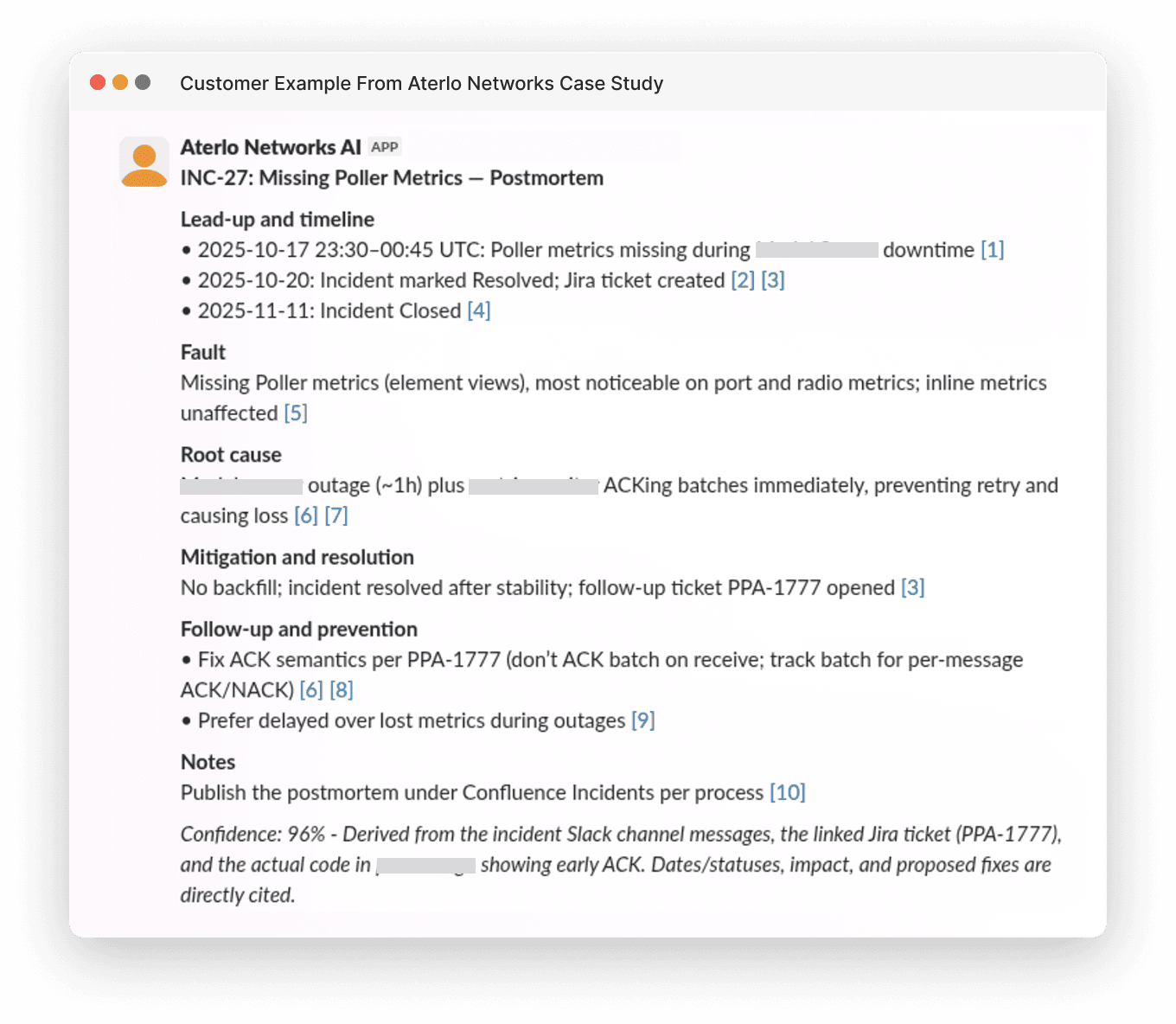 Sagi decided to try having Grapevine write the post-mortem based on one of their Confluence templates. Grapevine generated a complete post-mortem in minutes, referencing the Slack incident thread and related Jira tickets.