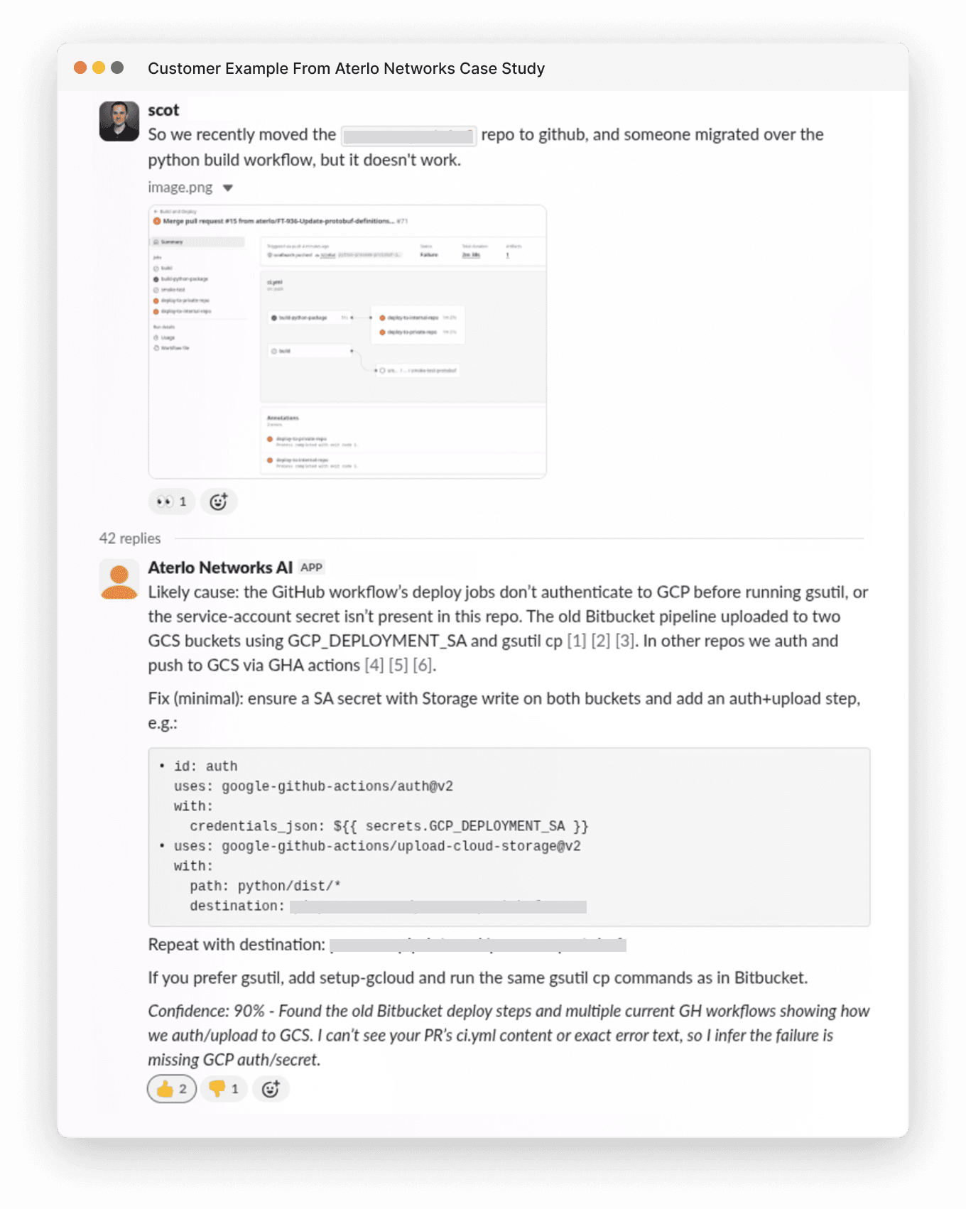 When Aterlo Networks migrated a repository from Bitbucket to GitHub, their deployment unexpectedly broke. The CTO, Scot, posted the error in Slack, and Grapevine proactively jumped into the thread.