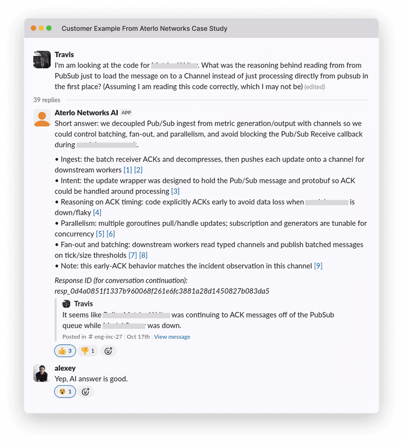 One morning in a Slack channel at Aterlo Networks, Travis, a developer, asked a question that would normally require an engineer with expertise in another area of the platform: "What was the reasoning behind reading from PubSub to load the message onto a Channel instead of processing directly from PubSub in the first place?"
