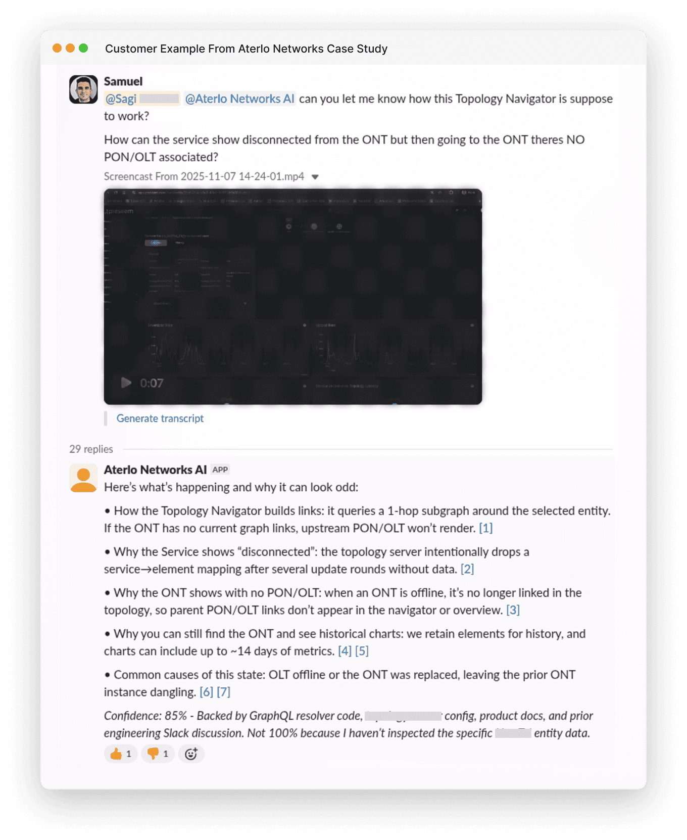Instead, Samuel asked Grapevine directly. The AI analyzed the question against their documentation, past conversations, and code, then provided an answer with 85% confidence, citing the relevant sources.